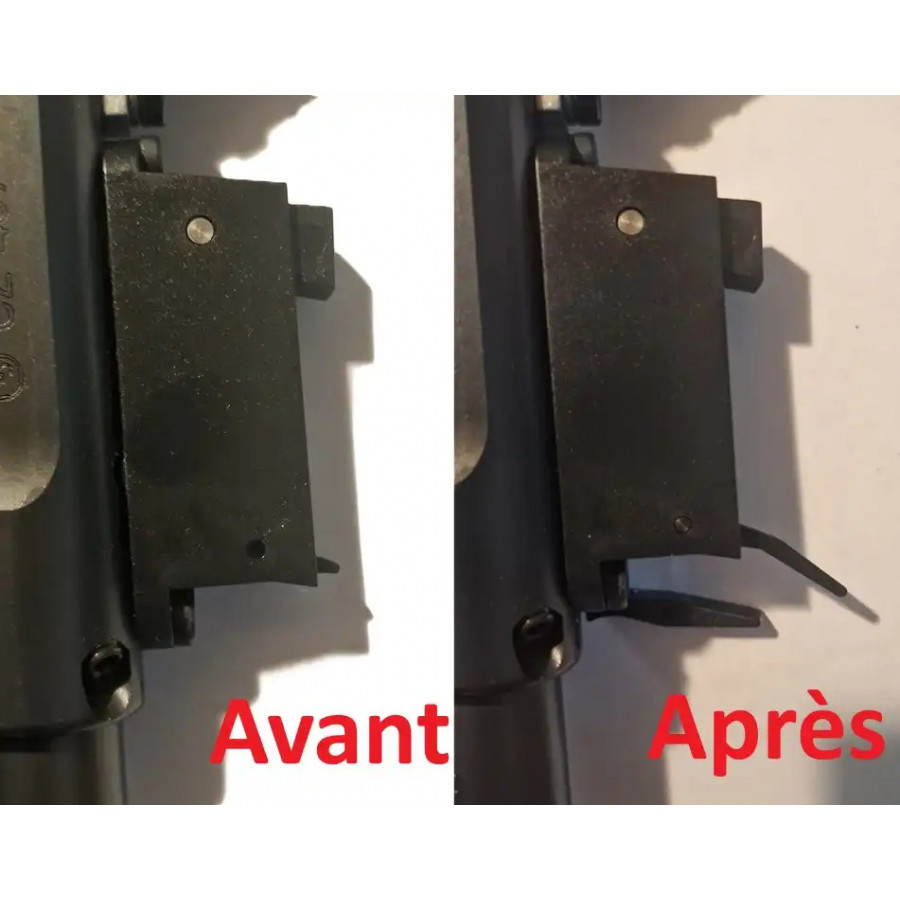 Il permet d’éjecter le chargeur bien plus facilement car nettement plus grand et mieux placé que le levier d'origine.