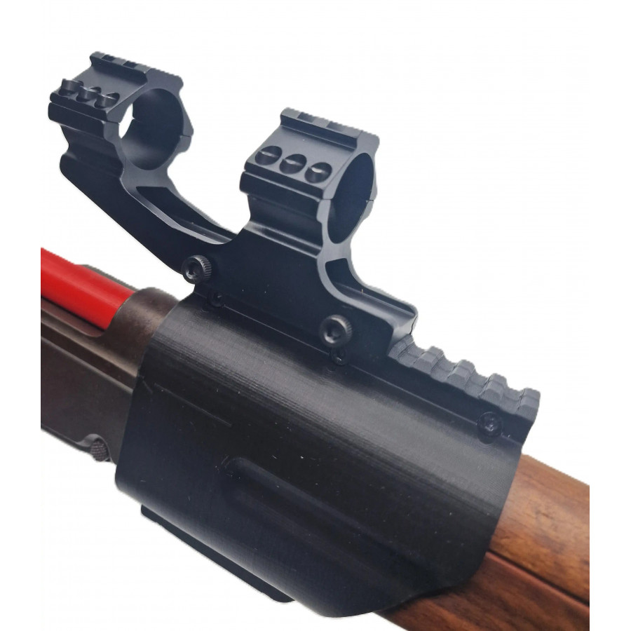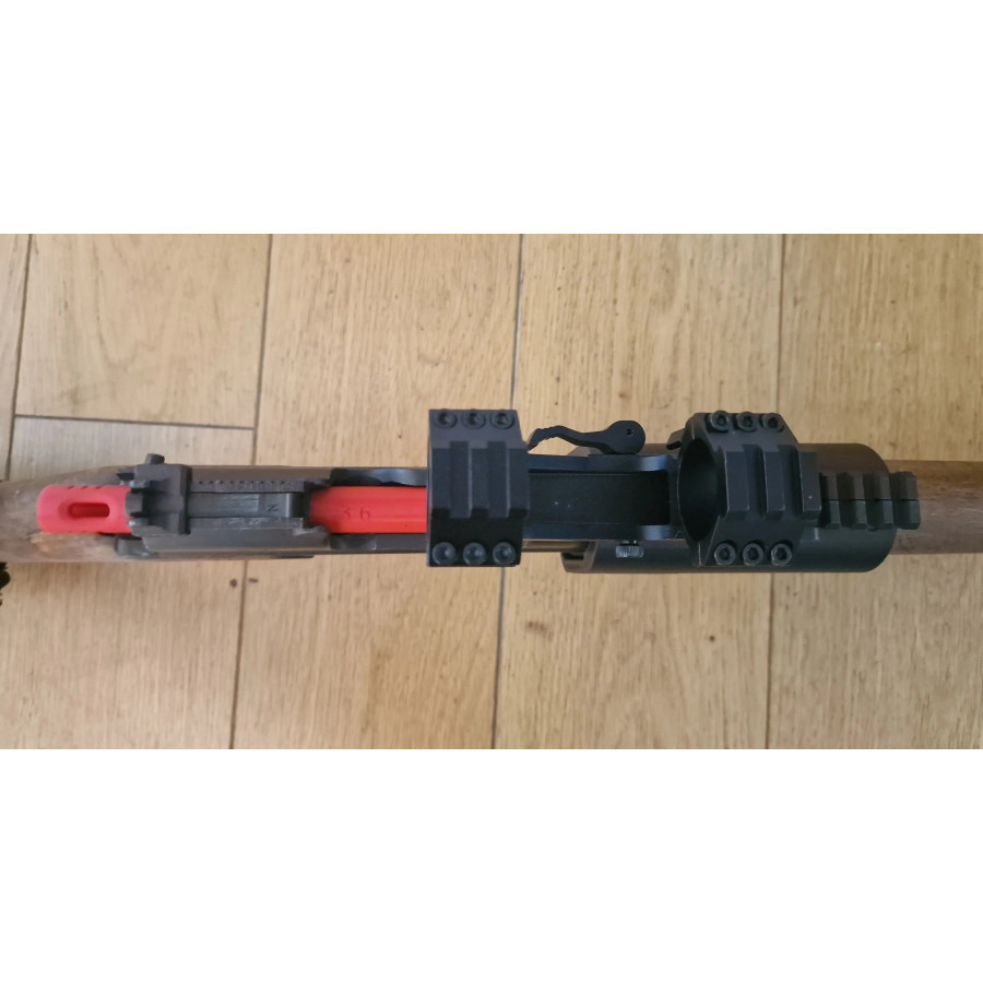 1- Adaptateur comportant un rails picatinny 20 mm avec 9 emplacements se fixant sur le boitier de culasse dans l'alignement de celui-ci pour fusil Schmidt Rubin.