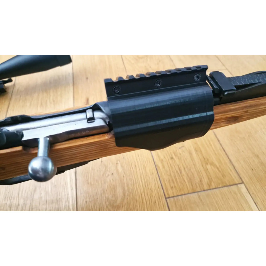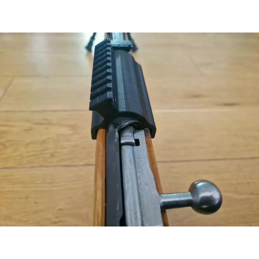 Adaptateur comportant un rails picatinny 20 mm avec 9 emplacements se fixant sur le boitier de culasse dans l'alignement de celui-ci pour fusil Mosin Nagant à levier d'armement droit.