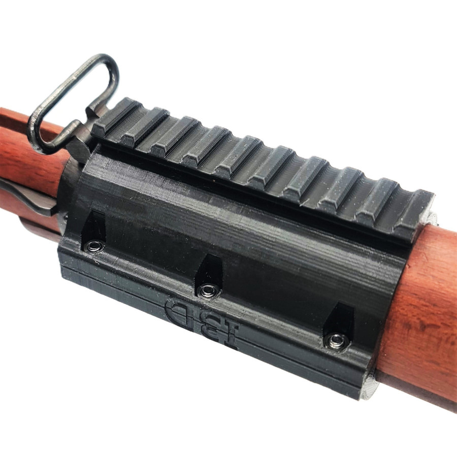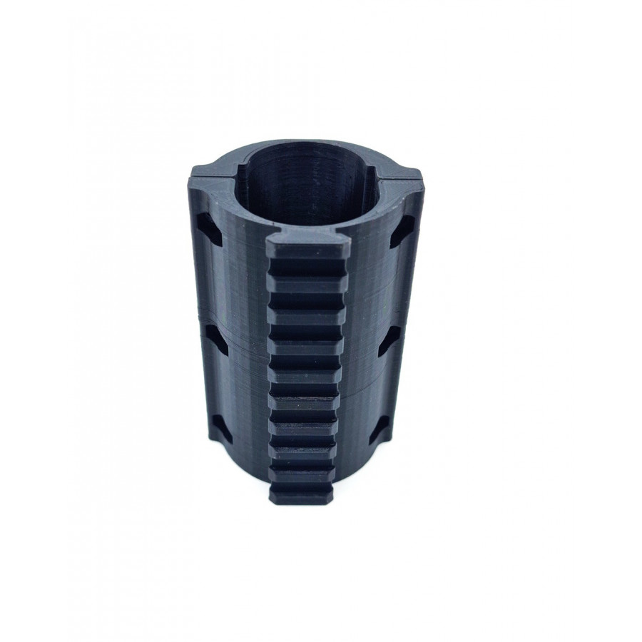 Adaptateur comportant un rail picatinny 20 mm de 9 emplacements se fixant en butée contre l'anneau de grenadière côté chargeur.