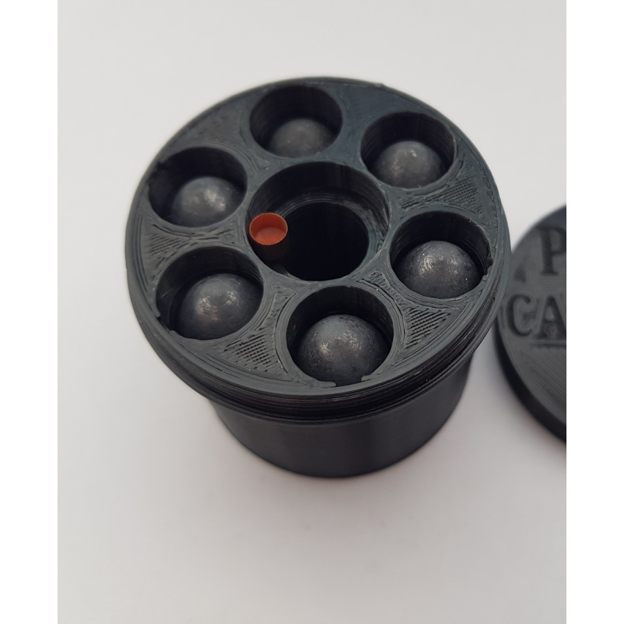 - Boite avec couvercle dévissable pour stocker jusqu'à 6 cartouches calibre 36 et 10 amorces