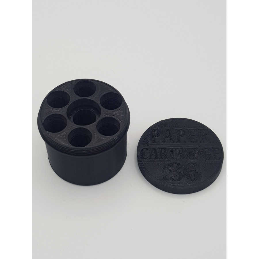 - Une boite avec couvercle dévissable pour 6 cartouches papiers Calibre 36 et un emplacement central pour 10 amorces