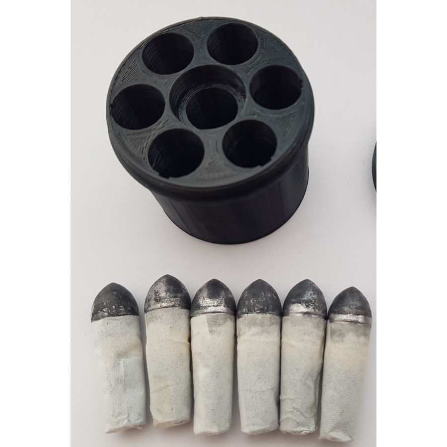 - Une boite avec couvercle dévissable pour 6 cartouches papiers Calibre 44 et un emplacement central pour 10 amorces