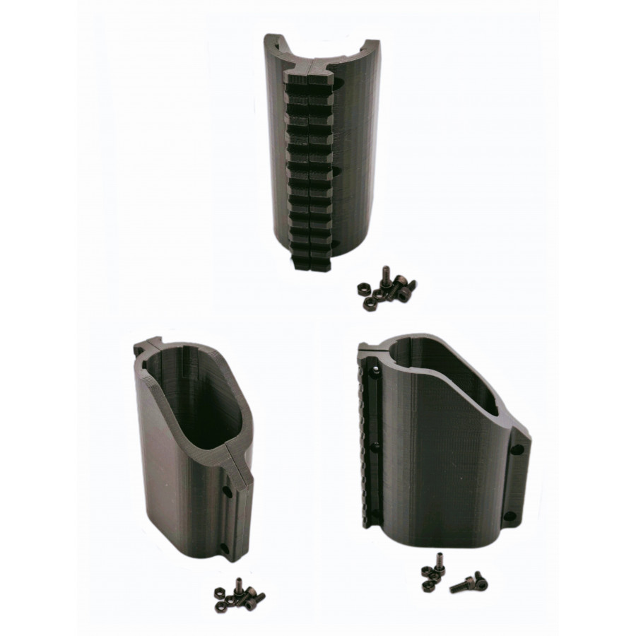 Une fois posé, l'adaptateur s'attache grâce à 5 couples vis BTR / Ecrou (fournis). Il est ensuite maintenu durablement grâce à ses deux demi-coques entourant la crosse et le boitier de culasse, pour un maintien optimal.
