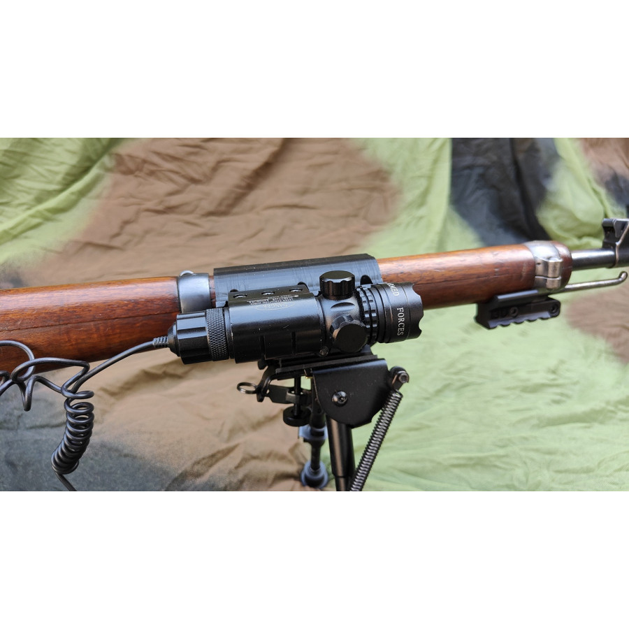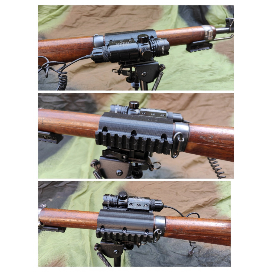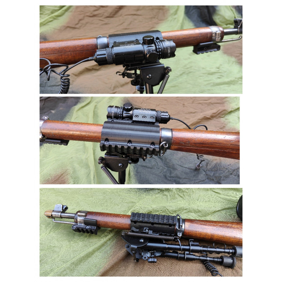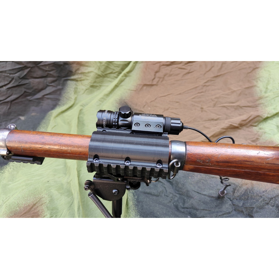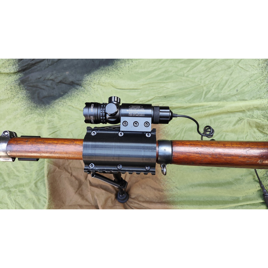 Adaptateur comportant un rail picatinny 20 mm de 9 emplacements se fixant entre l'anneau de grenadière et le porte-baïonnette pour fusil Schmidt Rubin 1889.