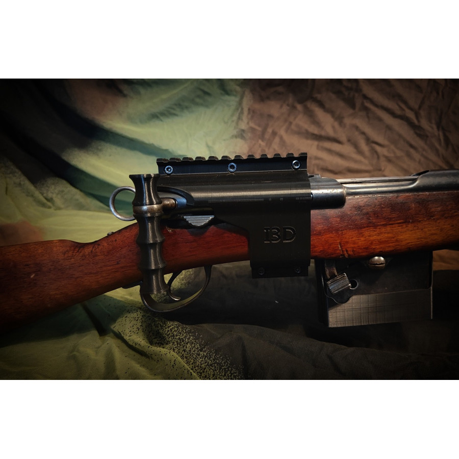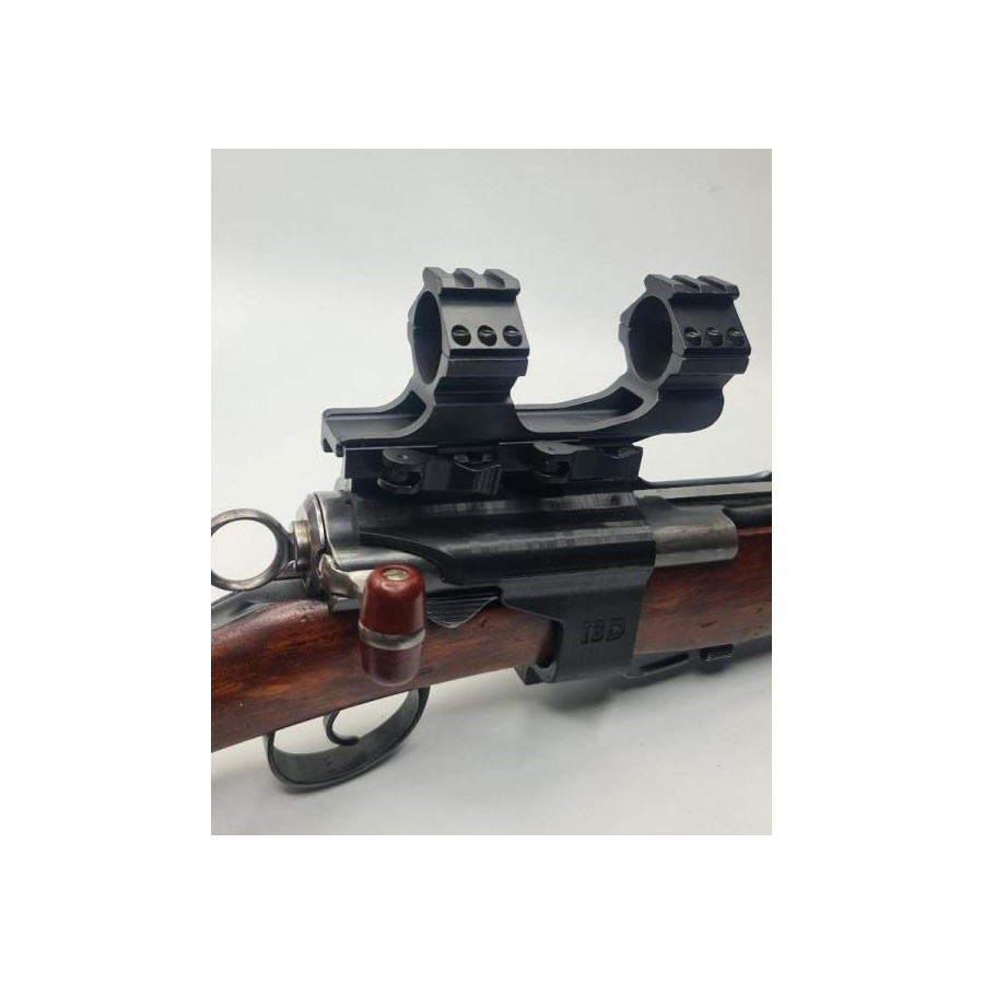 1- Adaptateur comportant un rail picatinny 20 mm avec 9 emplacements se fixant sur le boitier de culasse dans l'alignement de celui-ci pour fusil Schmidt Rubin.