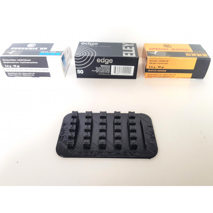 Ce système convient aux deux types de boites de cartouches 22LR les plus courantes, celles avec des pieds de support (type RWS, CCI etc..) mais également celle sans aucun pied de support (type Eley).